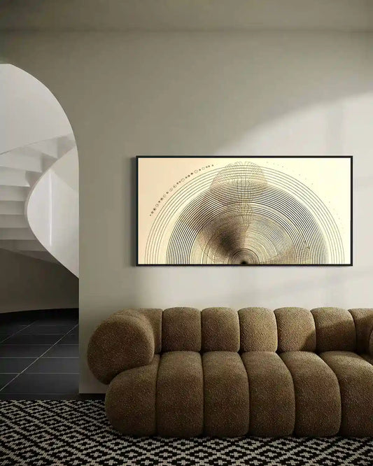 Tidal Orbits digital art print on oversized wall art in a minimalist elegant bedroom, featuring concentric circles and intricate patterns, adding abstract art and geometric elegance to the space.
